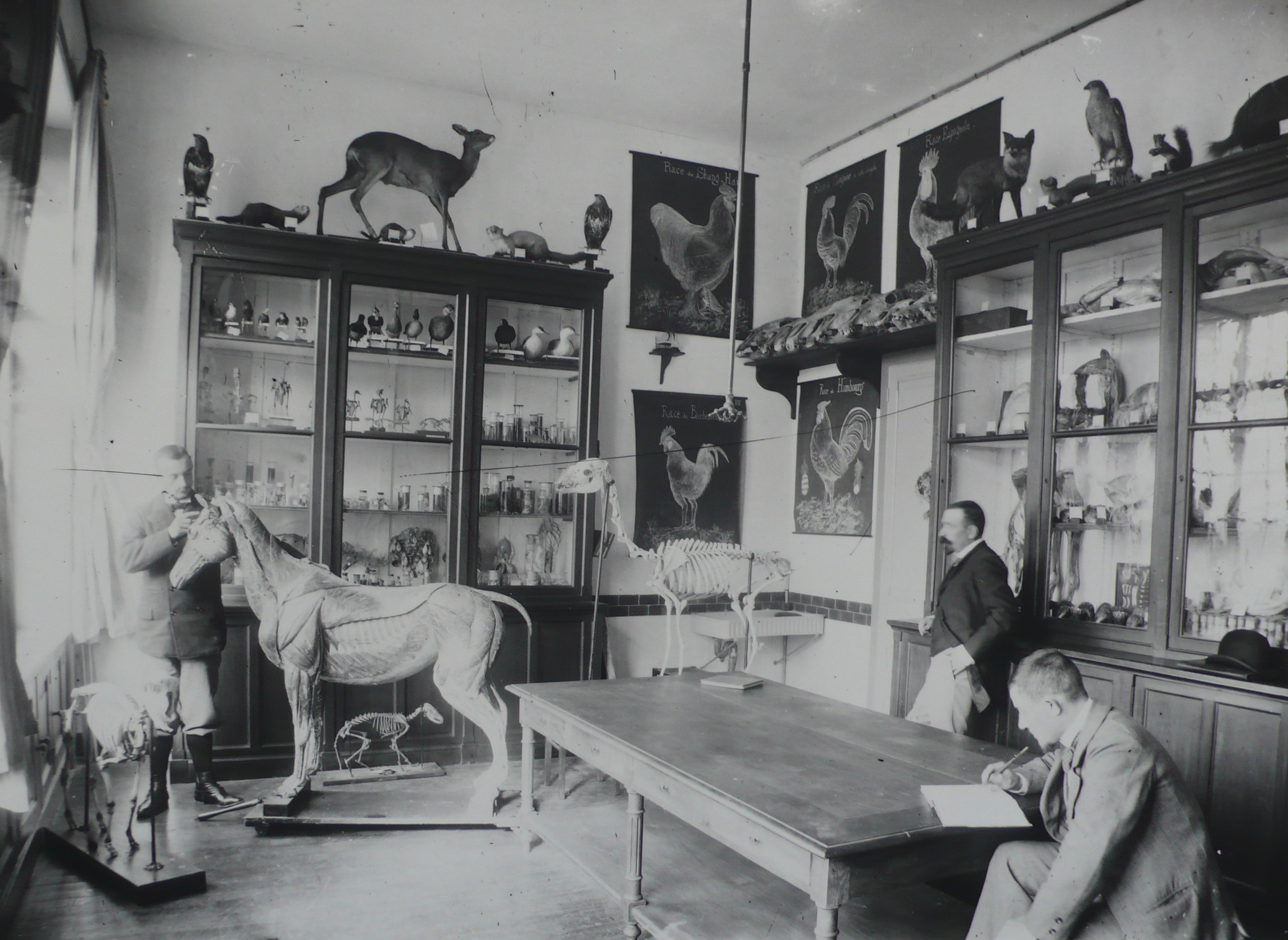 Animal husbandry [zootechnie] exam at the l’École Nationale d’Agriculture in Rennes, France. The teacher listens to the student in front of the model horse, while the other student prepares his answer to the question drawn at random, 1915 [Institut Agro Rennes-Angers]